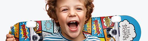 Bei Skateshop24 gibt es echte Skateboards in Kindergröße: 7-lagiges kanadisches Ahornholz, abgestimmte Trucks, weiche Urethan-Rollen – dieselbe Qualität wie bei den Großen, nur kleiner.